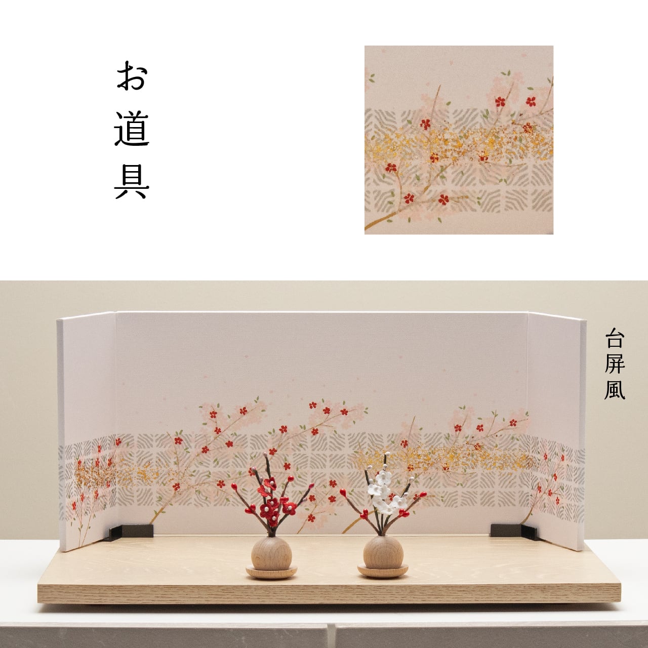 飾台(木目ナチュラル色)、親王台×2、貝桶×2、紅白梅×2、燭台×2