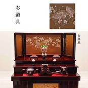 お道具類も同系色で統一してあり、おひなさまの上品さと気品を演出しています。