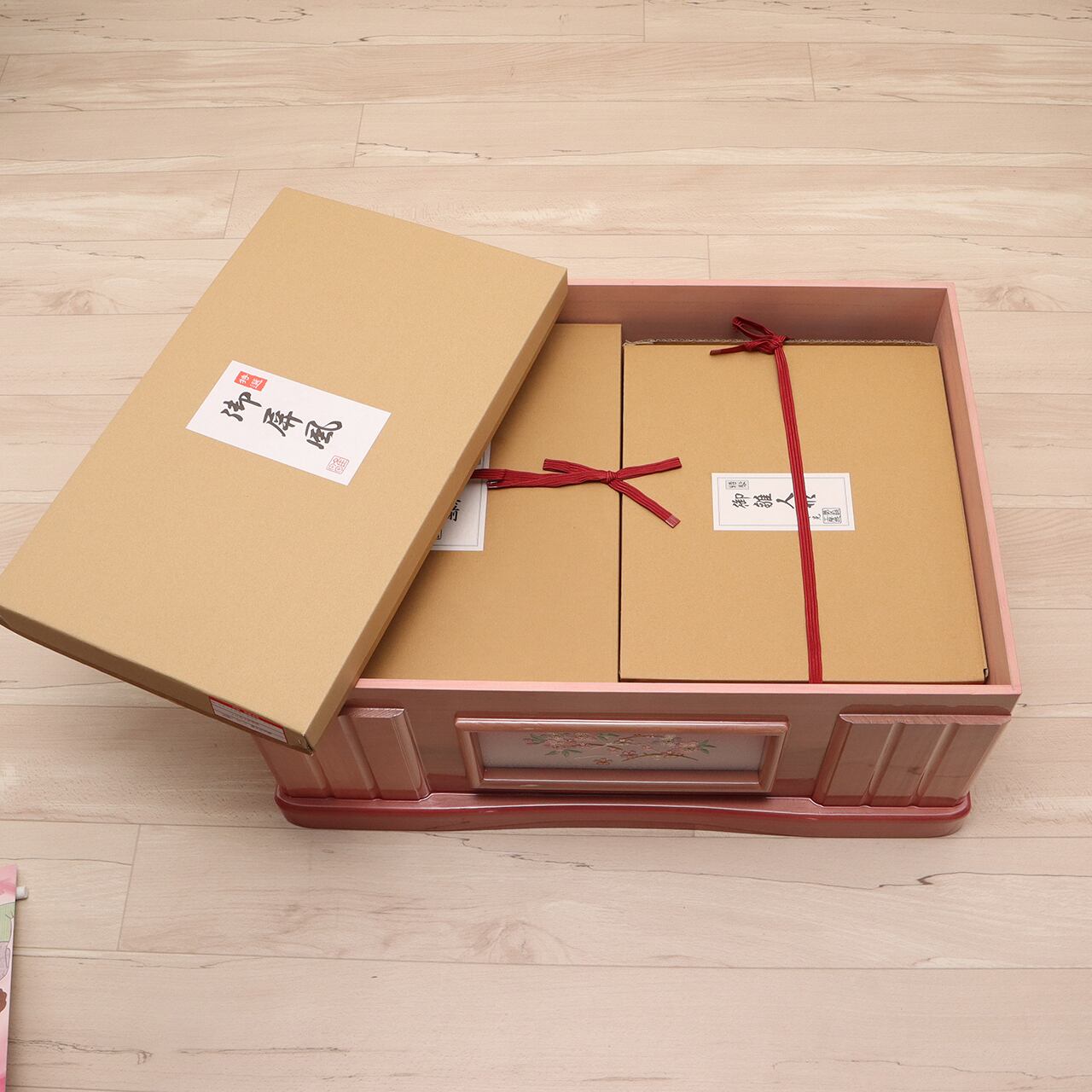 収納箱はパールピンクでとても目を引きます。屏風と幕板の枝桜刺繍が豪華です。