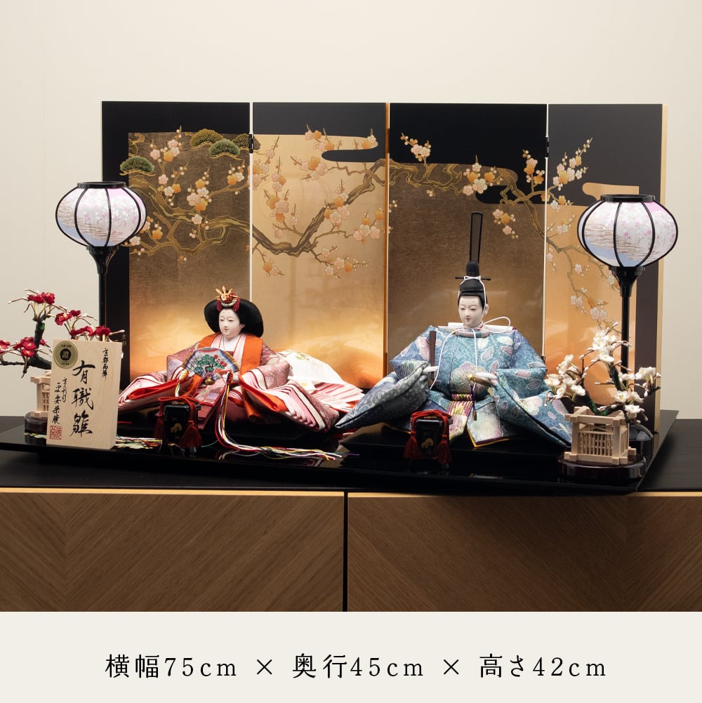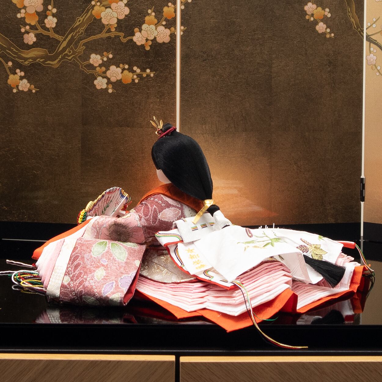 職人が金箔を一枚一枚貼り合わせた金箔屏風に、縁起の良い松梅桜の金彩加工を施した飾り台に、美しく絵画的な模様で古くから人気の高い辻が花を正絹生地に施しおひなさまを合わせた作品となっております。