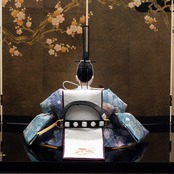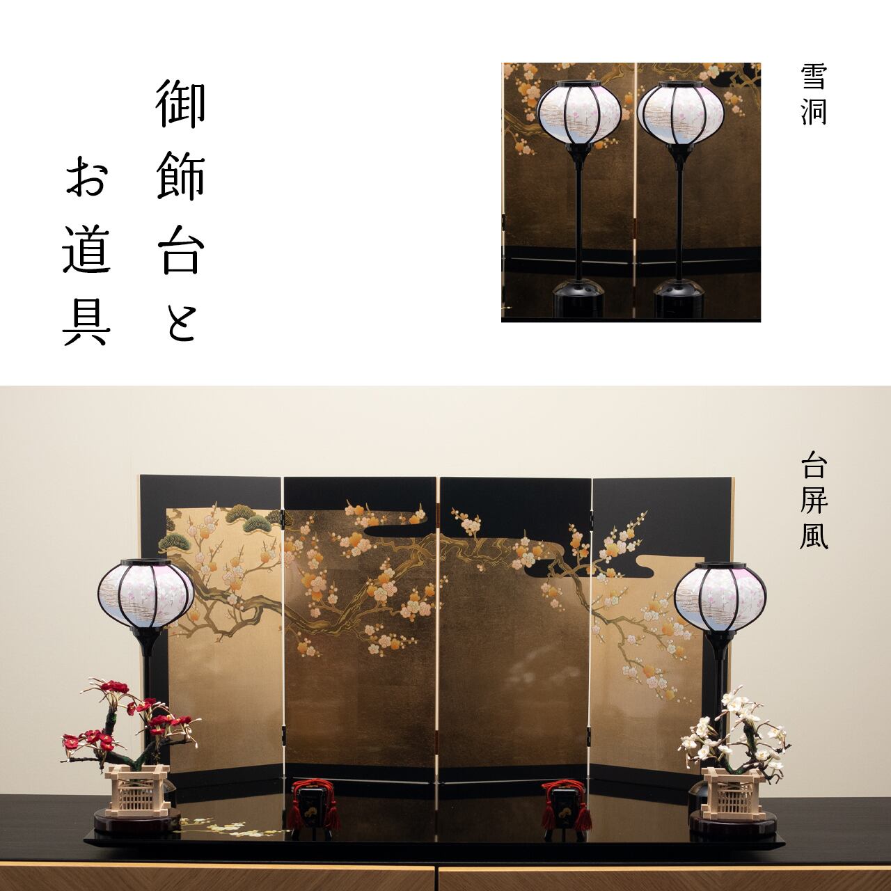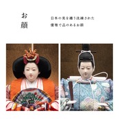 繭玉紅白梅、御道具の貝桶、雪洞までも拘りの逸品で、内裏様のお顔は現代的なすっきりとしたお顔です。