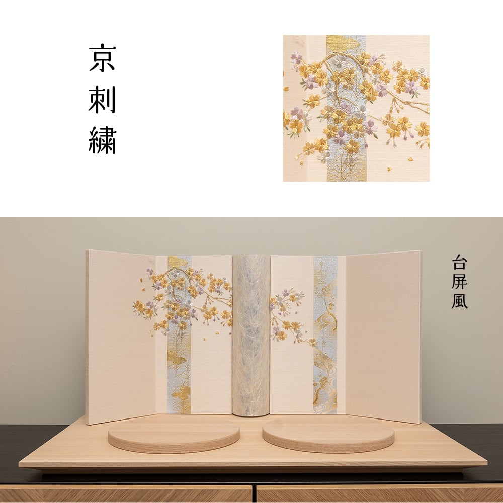 白木調の飾り台と親王台に白基調の屏風。その枝桜刺繍の中央にはLED式の灯りがあります。