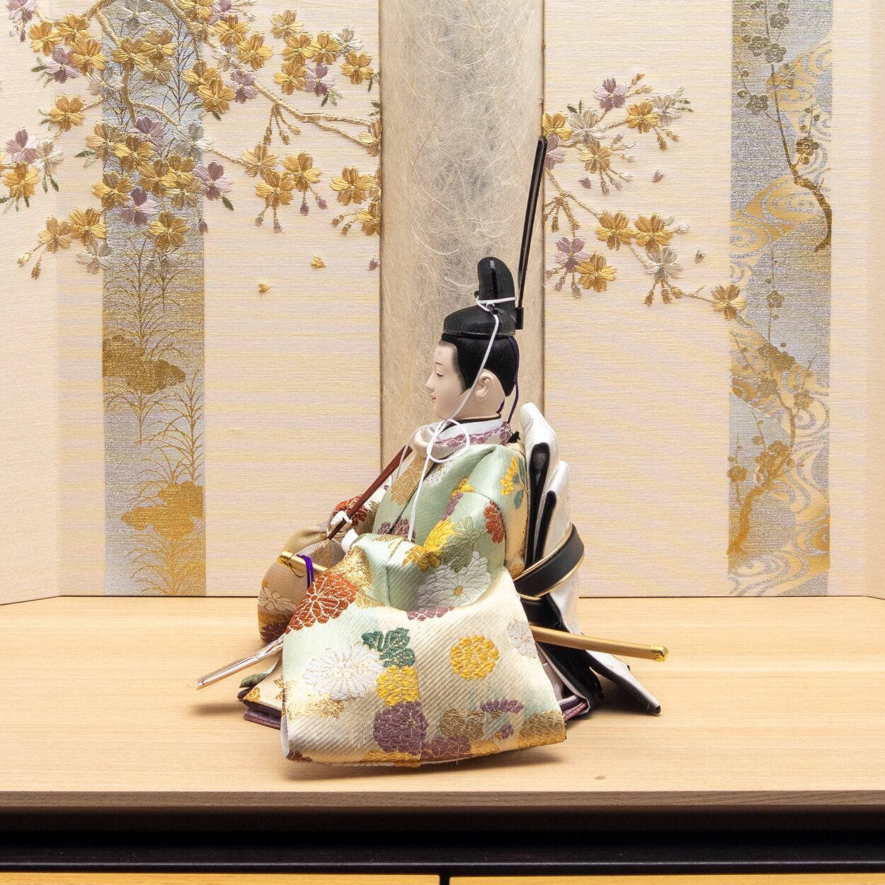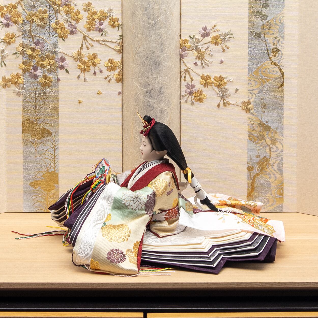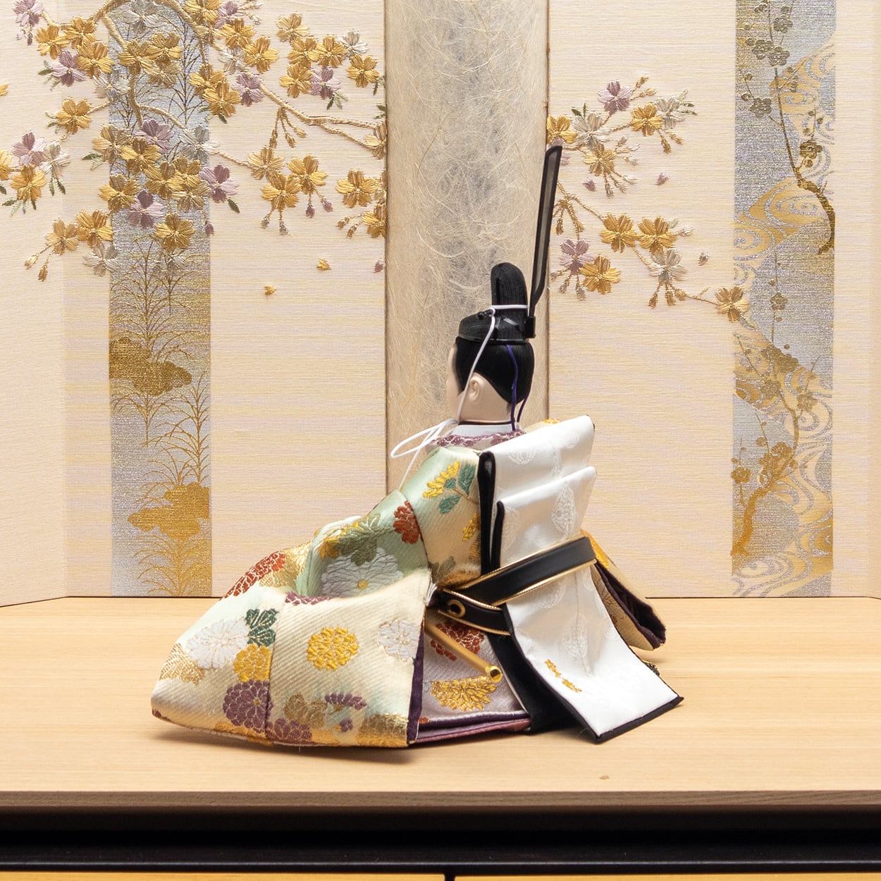 お人形には古典的な文様かつ上品な正絹〆切染め西陣織親王を合わせた作品となっております。
