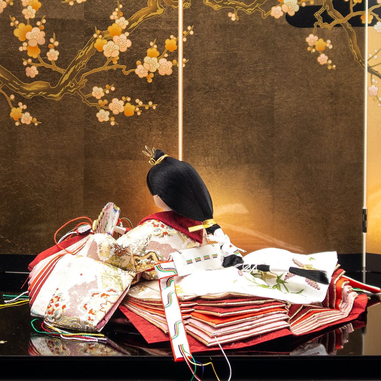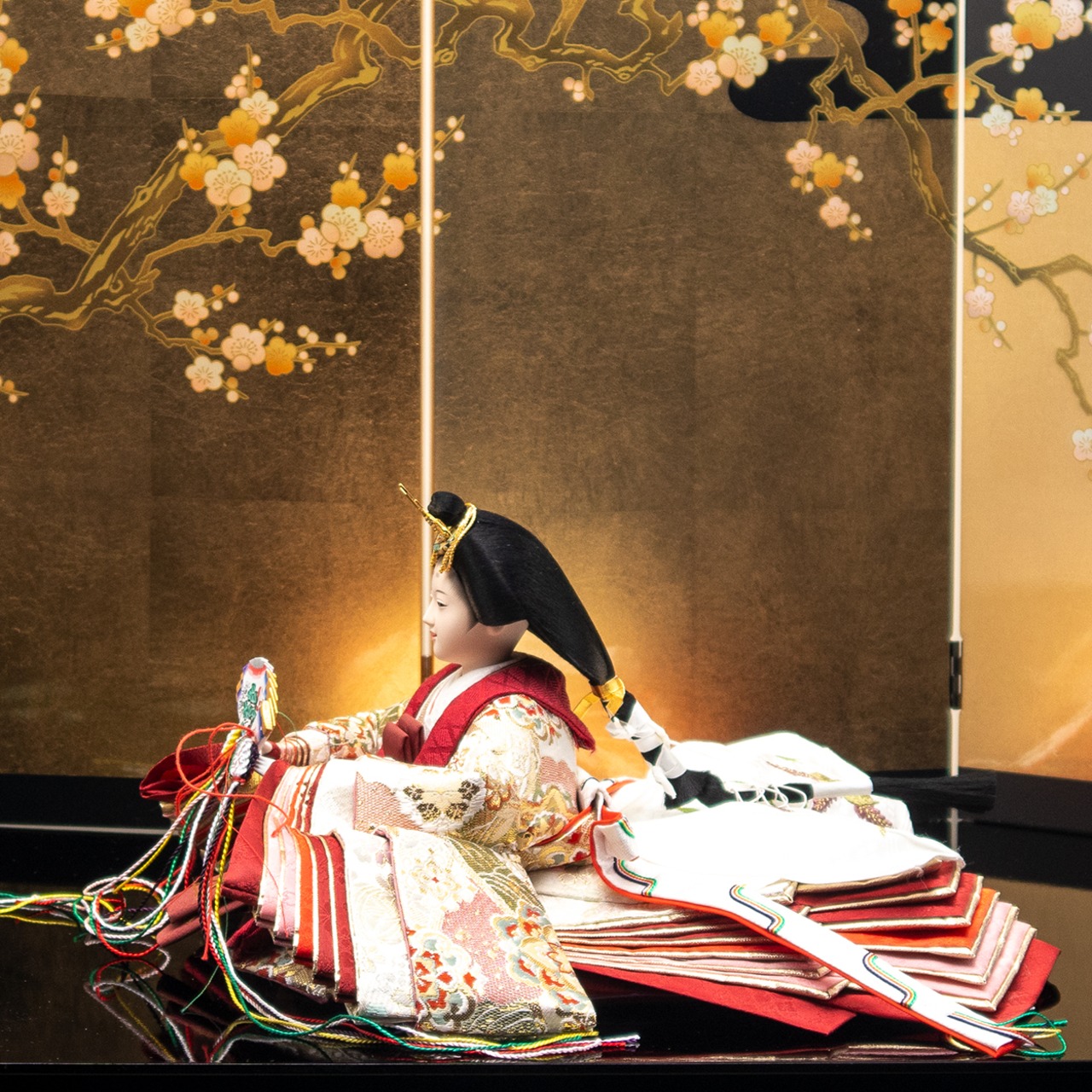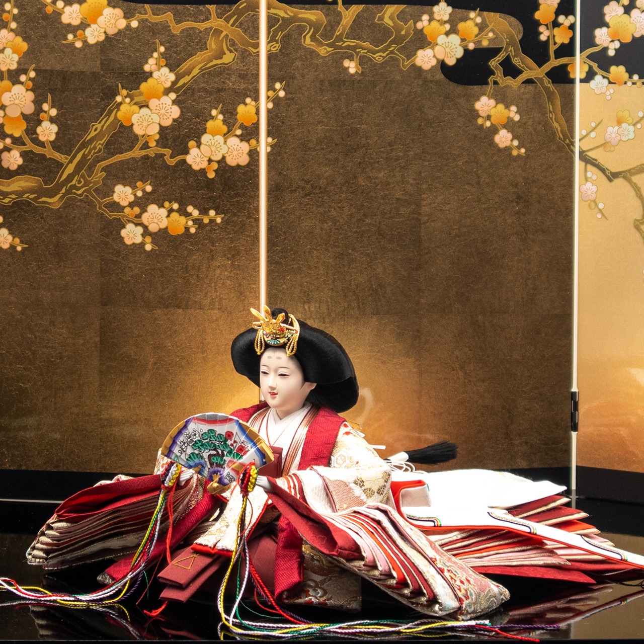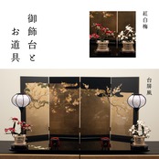 飾台(黒塗)、親王台×2、お道具(貝桶松葉)×2、紅白梅×2、雪洞(コードレス)×2