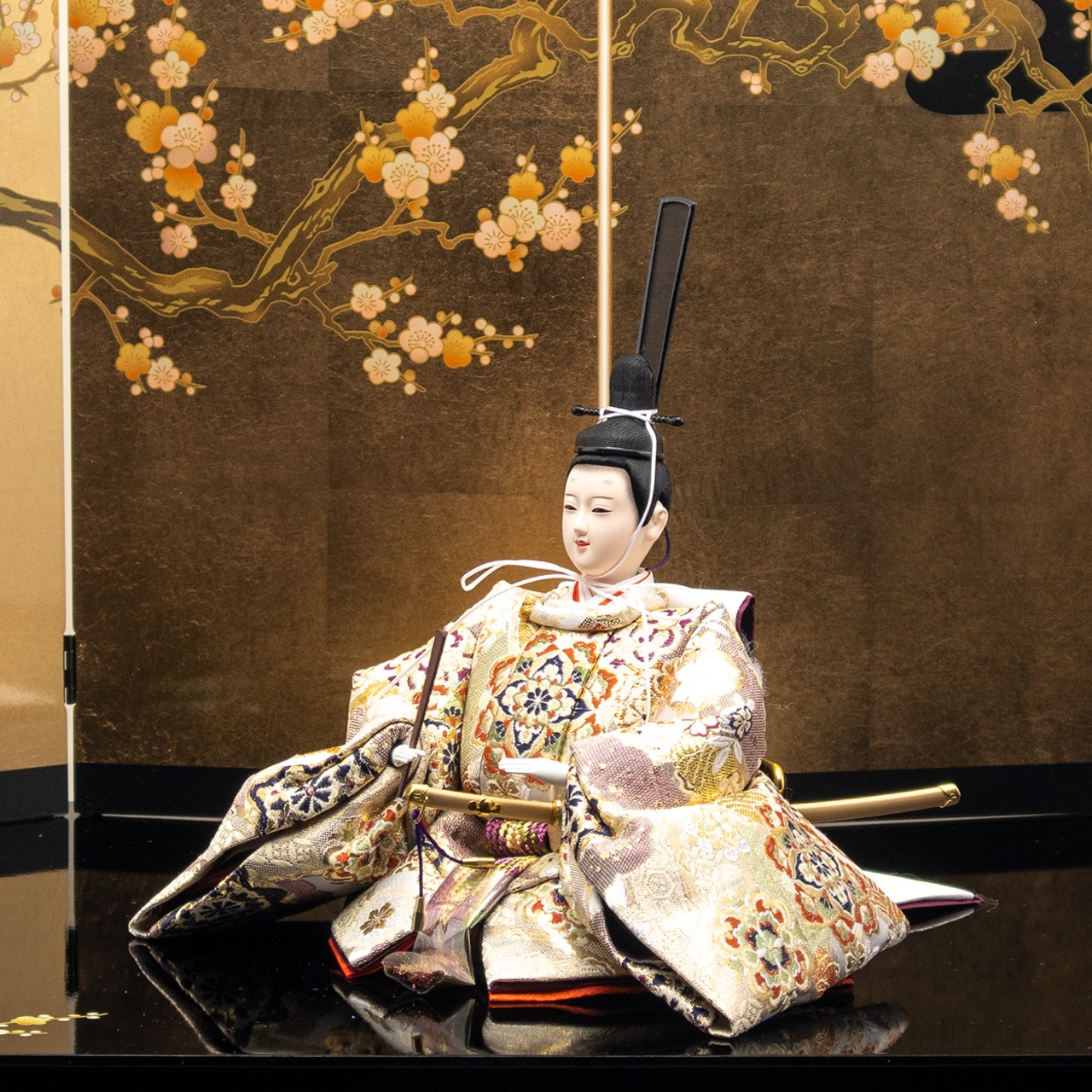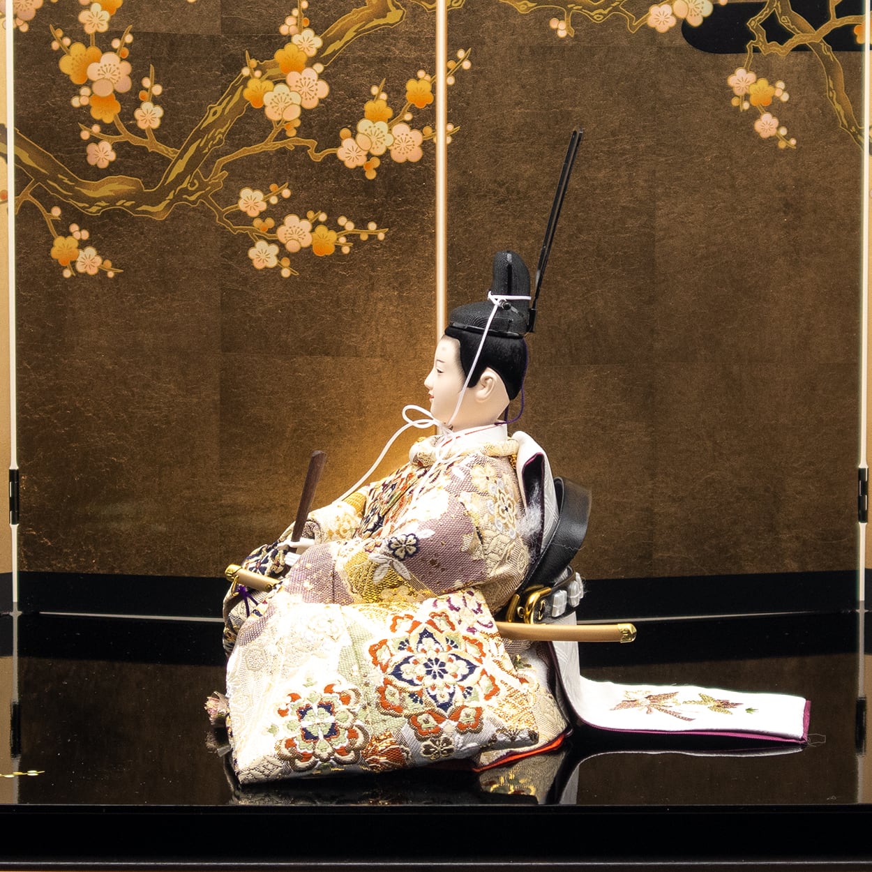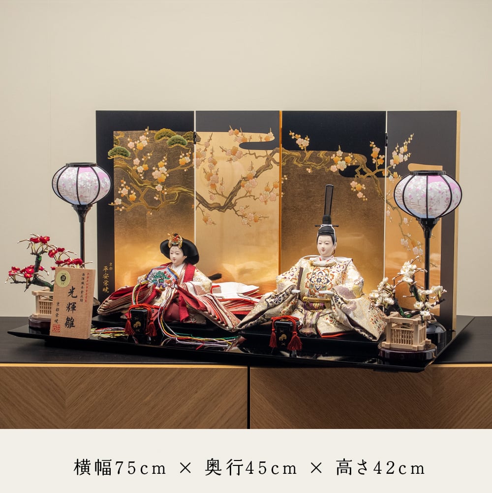 お人形には京都府知事賞を受賞した本金正絹帯地調の高級西陣織を使用した光輝雛を合わせております。