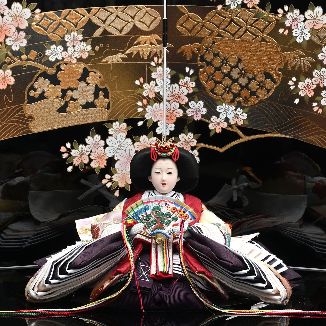 七宝柄(円満・調和・ご縁)と波柄(未来永劫へと続く幸せの願い)に縁起の良い松竹梅の豪華な金彩が施された屏風に正絹〆切染親王を合わせた作品となっております。