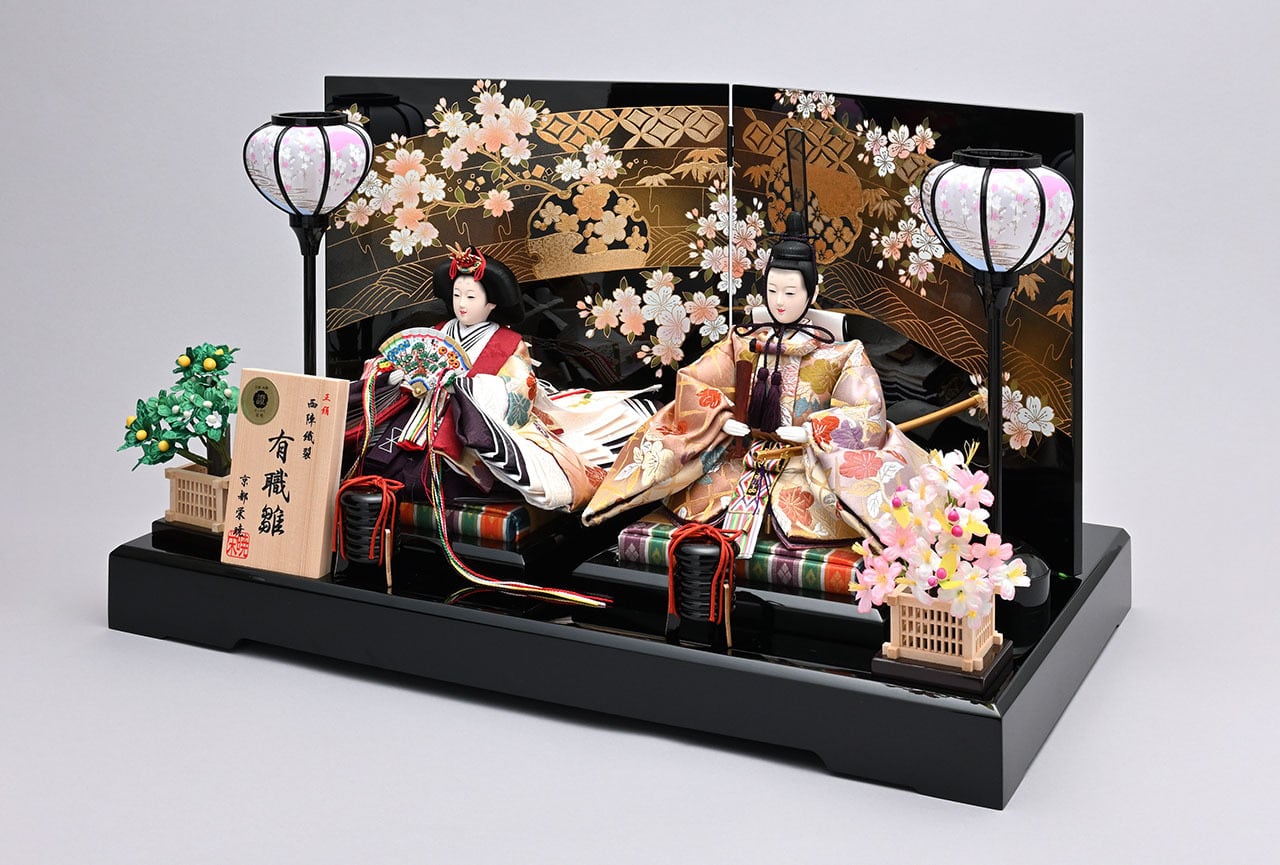 飾台(古代塗畳台)、親王台×2、お道具(古代塗三宝)、桜橘×2、雪洞(コードレス)