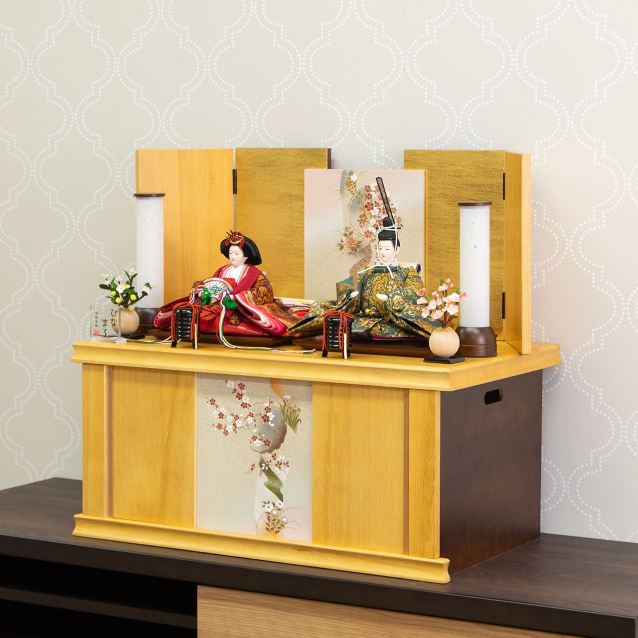収納台(ひのき)、親王台×2、お道具(行器)×2、桜橘×2、雪洞(コードレス)×2