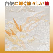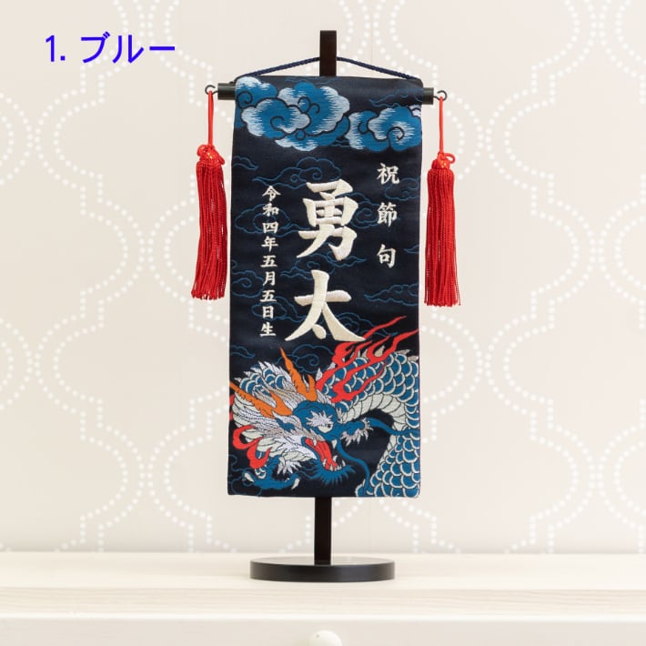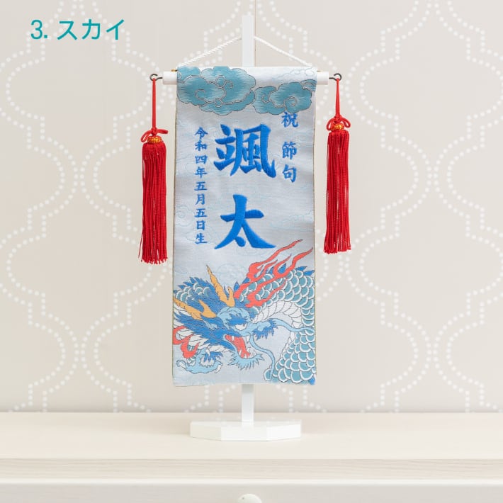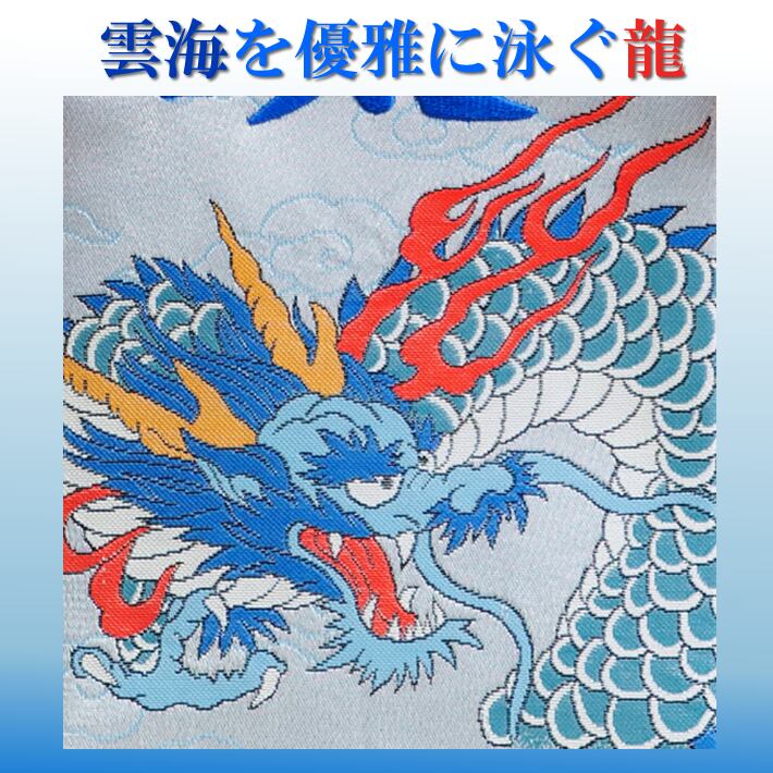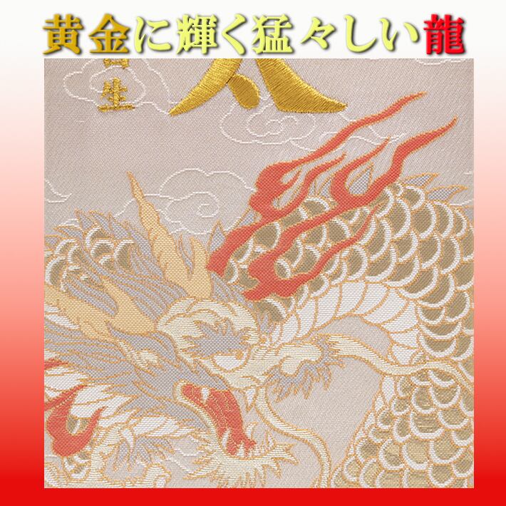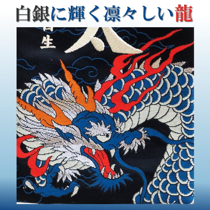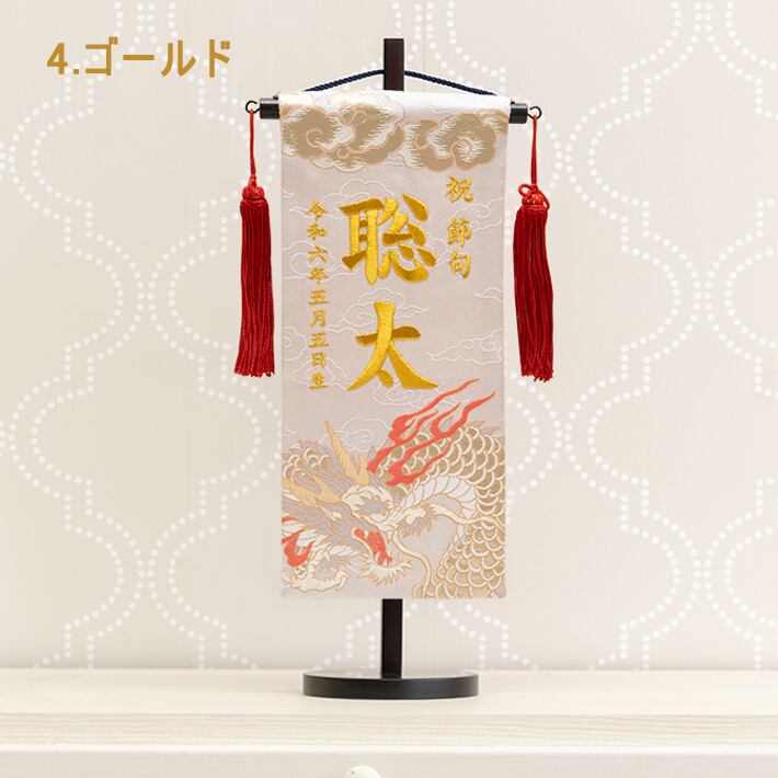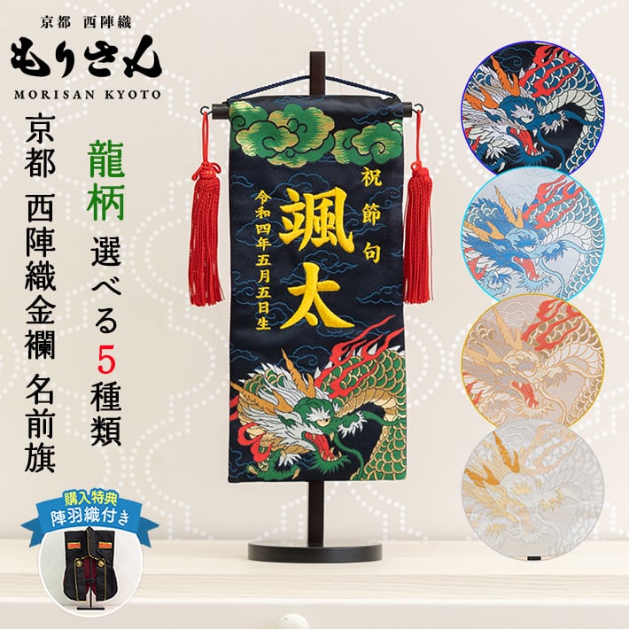 端午の節句 の五月人形の脇役として、今までになかった西陣織金襴で力強く舞う龍柄の 名前旗を室内飾り用として誂えました。色彩豊かなデザインとなっています。