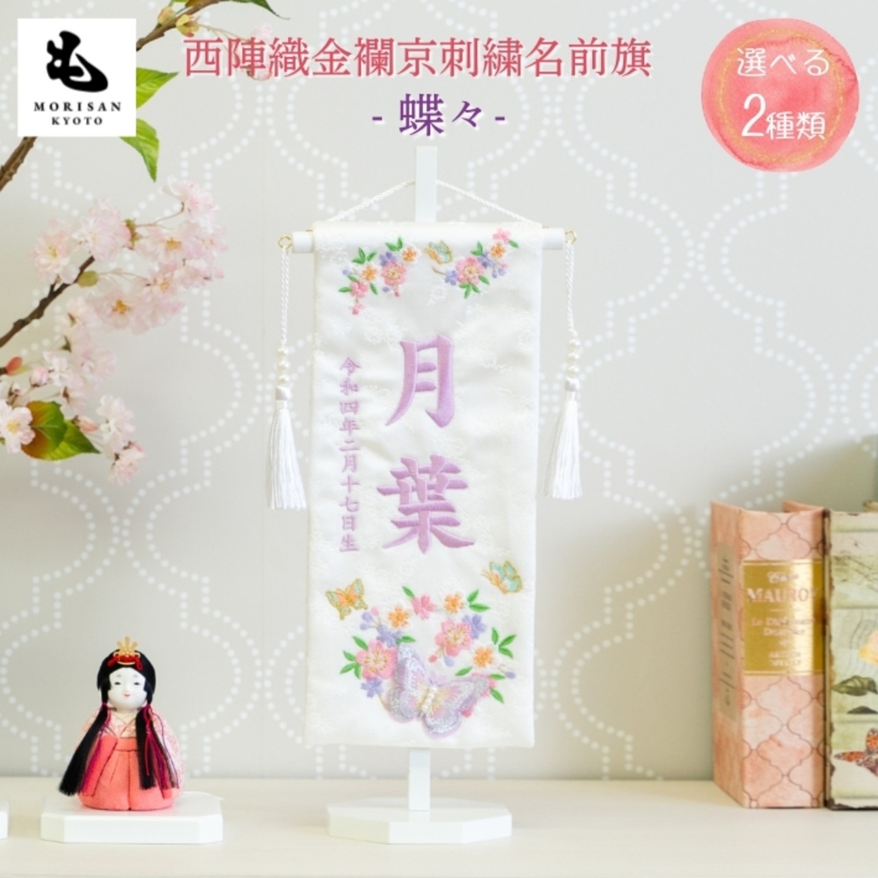 *お雛様の衣裳生地を手掛ける京都西陣金襴織元であるもりさんが特別に誂えたオリジナル名前旗です